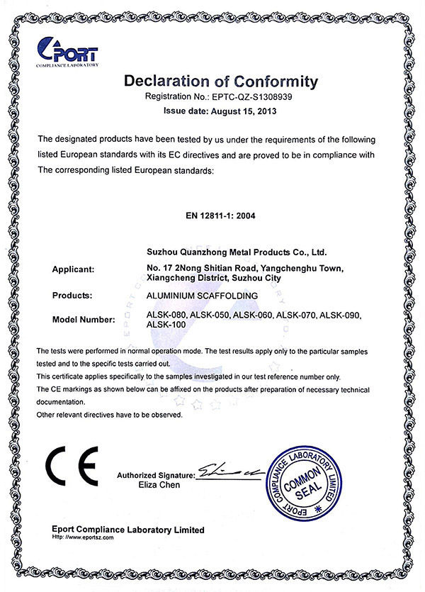 开云体育-开云(中国) 专注铝合金制品的开发“产品就是人品”的企业理念,不断进行技术创新、设备创新、服务创新、和管理方式创新来继续研发出更多满足未来发展需要的产品, 公司产品通过欧盟认证取得CE认证并取得证书,铝合金脚手架系列产品通过SGS认证,铝合金平台和梯具类产品均严格按照GB12142-2007,GB17888等标准设计生产。