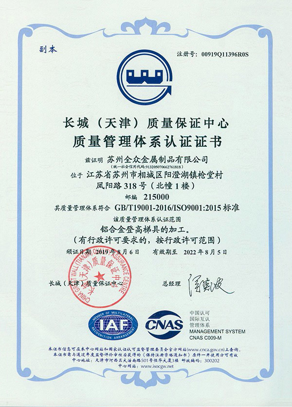 开云体育-开云(中国) 专注铝合金制品的开发“产品就是人品”的企业理念,不断进行技术创新、设备创新、服务创新、和管理方式创新来继续研发出更多满足未来发展需要的产品, 公司产品通过欧盟认证取得CE认证并取得证书,铝合金脚手架系列产品通过SGS认证,铝合金平台和梯具类产品均严格按照GB12142-2007,GB17888等标准设计生产。